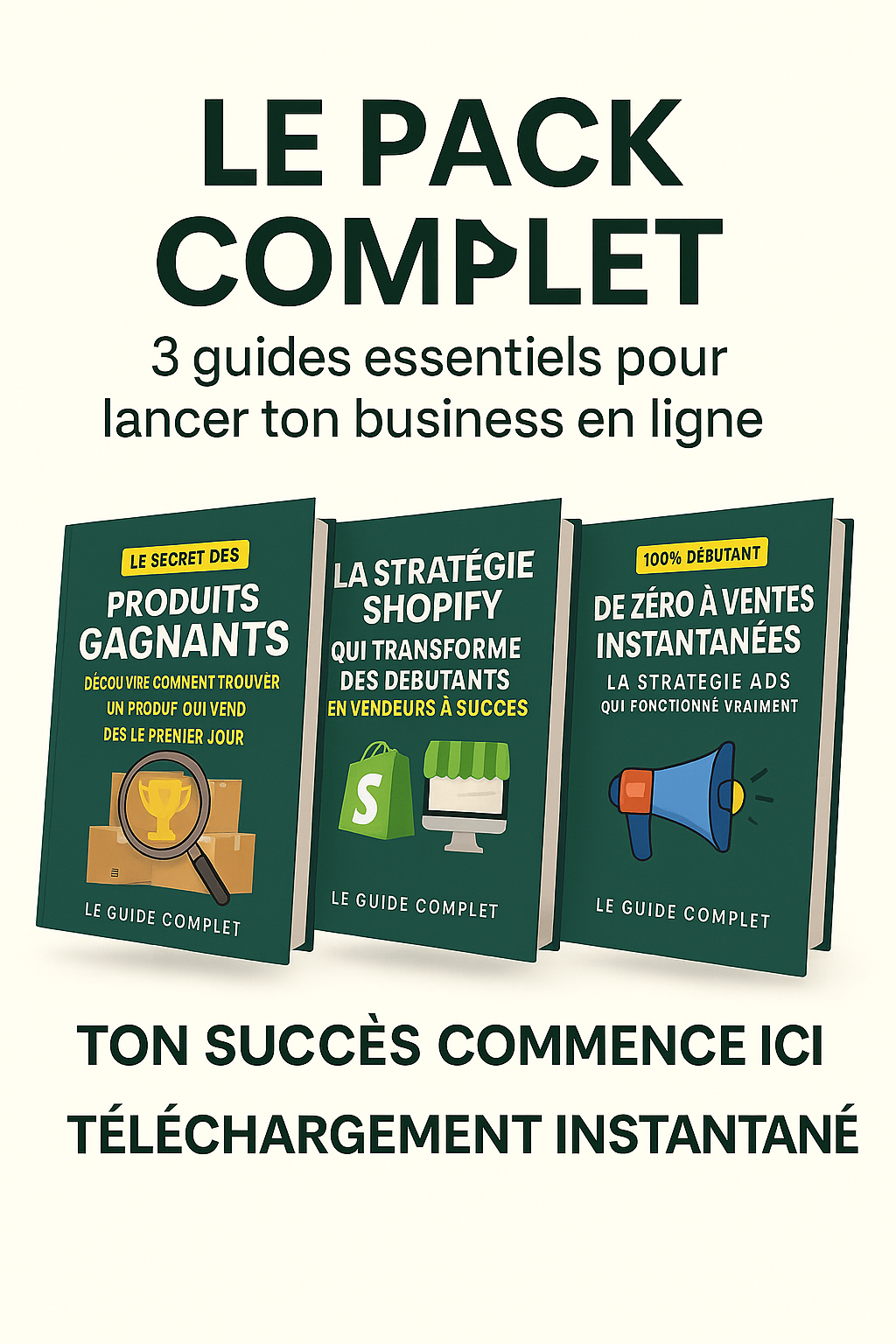 Tu veux te lancer dans l'e-commerce mais tu ne sais pas par où commencer ? Ce pack de 3 guides ultra-complets est fait pour vous. Que tu sois débutant total ou que tu veuilles structurer ton entreprise, tu vas enfin avoir une méthode claire, étape par étape , pour réussir.